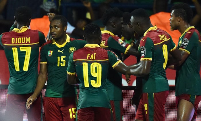 | WACHEZAJI WA CAMEROON WAKISHANGILIA GOLI LAO LA KWANZA. |